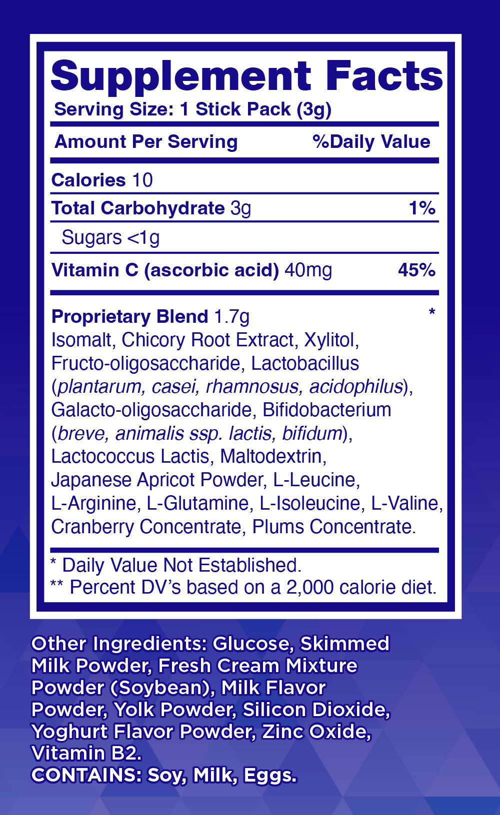 Isomalt, Glucose, Chicory Root Extract, Skimmed Milk Powder, Fresh Cream Mixture Powder (Soybean), Xylitol, Fructo-oligosaccharide, Vitamin C (ascorbic acid), Milk Flavor Powder, Galacto-oligosaccharide, Lactobacillus plantarum, Lactobacillus casei, Lactobacillus rhamnosus, Lactobacillus acidophilus, Yolk Powder, Silicon Dioxide, Yoghurt Flavor Powder, Bifidobacterium breve, Lactococcus Lactis, Bifidobacterium animalis ssp. lactis, Maltodextrin, Bifidobacterium bifidum, Japanese Apricot Powder, L-Leucine, L-Arginine, L-Glutamine, L-Isoleucine, L-Valine, Zinc Oxide, Vitamin B2, Cranberry Concentrate, Plums Concentrate