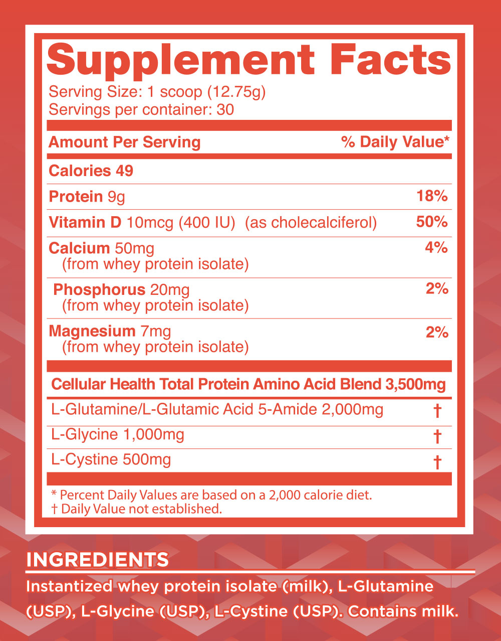 Instantized Whey Protein Isolate (milk), L-Glutamine (USP), L-Glycine (USP), L-Cystine (USP), Vitamin D3